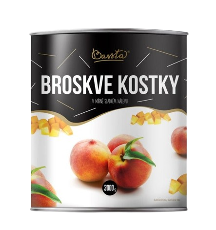 Sterilizované lúpané broskyne nakrájané na kocky, v mierne sladkom náleve. Typ spracovania ovocia ušetrí prácu pri zhotovovaní kompótov a ovocných jedál a preto je vhodný najmä do školských jedální.