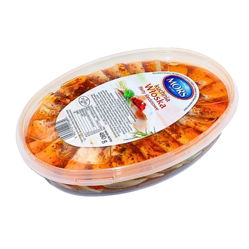 Zloženie: filety zo sleďa (60 %) (Clupea harengus)*, repkový olej, cibuľa (10 %), koreniny (1,5 %) (sušené paradajky, cesnak, provensálske bylinky, majorán, soľ), kyselina: kyselina octová, soľ, sladidlo: sacharín, sukralóza, konzervačná látka: sorban draselný, benzoan sodný, papriková aróma.