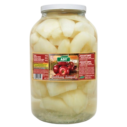 Jablkový kompót delený lúpaný. Obsahuje cukor a sladidlo.