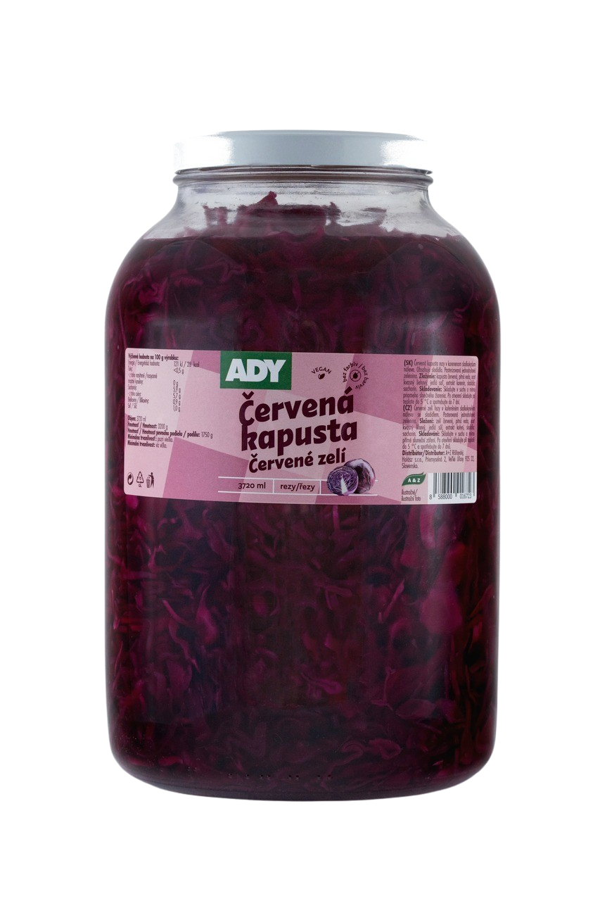 Zloženie: kapusta červená, pitná voda, ocot kvasný liehový, jedlá soľ, extrakt korenín, sladidlo: sacharín