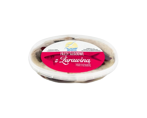 Zloženie: filé zo sleďa atlantického marinované 50%, repkový olej, marinovaná cibuľa, voda, soľ, sušené brusnice 1%, kyselina (octová, mliečna, citrónová, jablčná, vínna, askorbová), sladidlo: sacharín, konzervačná látka: sorban draselný, benzoan sodný
