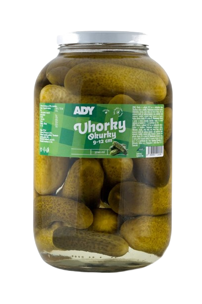 Uhorky o veľkosti 9-12 cm v sladkokyslom náleve. Obsahuje cukor a sladidlo.